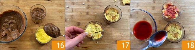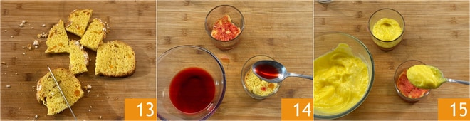 Luego cortad las rebanadas en trozos 13. Tomad 4 copas con una capacidad de 200 ml y forrad el fondo con trozos de colomba, aplanándolos ligeramente con las manos. Mojad la colomba con el alchermes 14 y cubrid con una capa de crema pastelera clásica 15.