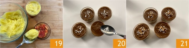 Acabad con una capa de crema pastelera clásica 19 y una capa de la de chocolate. Decorad con confites 20 y trocitos de almendra. Guardad en el frigorífico hasta el momento de servir vuestra sopa inglesa de colomba 21!