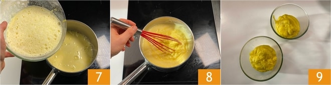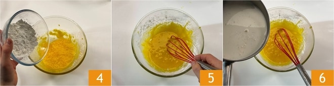 Añadid también la maicena 4 y mezclad de nuevo 5. En cuanto la leche haya alcanzado la ebullición, añadidla lentamente a la mezcla de huevos, removiendo para atemperarla 6.