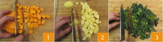 Para realizar la sopa vacíanevera, primero preparad las verduras: limpiad la calabaza y cortadla en trozos 1, necesitaréis unos 500 g de pulpa, luego pelad las patatas y también cortadlas en cubos 2. Cortad el cabello negro en tiras 3.