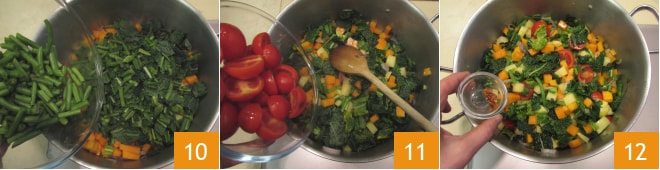Añadid también el cabello negro, las judías verdes 10 y los tomatitos 11, mezclad y cocinad durante 3-4 minutos a fuego medio, luego añadid la guindilla triturada 12.