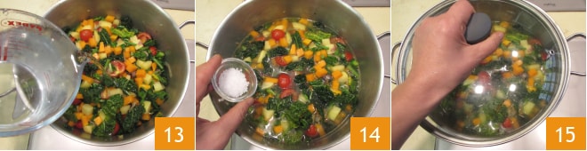 En este punto, verted el agua que deberá cubrir las verduras 13, añadid la sal gruesa 14, cubrid con una tapa 15 y cocinad a fuego lento durante unos 40 minutos o hasta que las verduras estén cocidas.