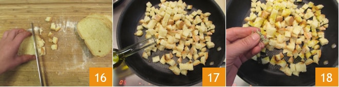 Mientras tanto, preparad los picatostes: cortad el pan en cubos 16, colocadlos en una sartén ya caliente y condimentad con aceite 17, sal y orégano 18.