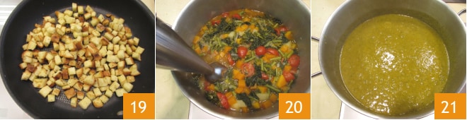 Tostad los picatostes hasta que estén bien dorados 19, luego reservadlos. Cuando las verduras estén cocidas, triturad la sopa con una batidora de inmersión 20 hasta obtener una consistencia homogénea 21.