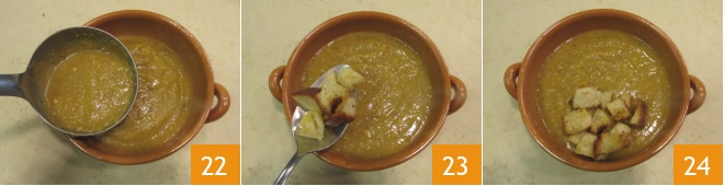 Verted el puré de verduras en los platos 22, añadid los picatostes 23 y condimentad con un hilo de aceite en crudo: ¡vuestra sopa vacíanevera está lista para ser servida bien caliente 24!