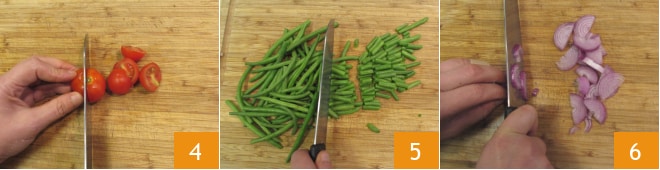 Dividid los tomatitos a la mitad 4, luego quitad las puntas de las judías verdes y cortadlas en 2 o 3 partes 5. Finalmente mondad la cebolla y cortadla finamente 6.