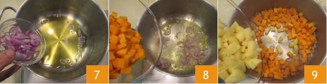 Calentad un chorro de aceite en una olla grande, agregad la cebolla 7 y dejadla pochar durante unos minutos. Añadid la calabaza 8 y mezclad, luego añadid las patatas 9.