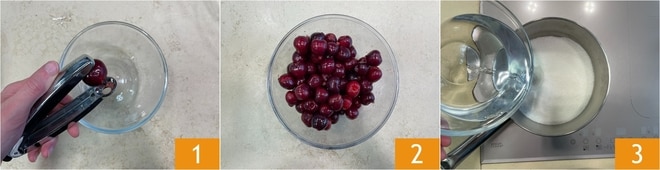 Para preparar el sorbete de cerezas, primero lavadlas bien y deshuesadlas 1. En total necesitaréis 700 g de cerezas deshuesadas, sin pedúnculo 2. En un cazo verted el azúcar y el agua 3.