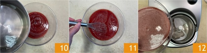 Añadid el jarabe, ya a temperatura ambiente 10 y mezclad 11. Verted la mezcla en la heladera y encendedla 12.