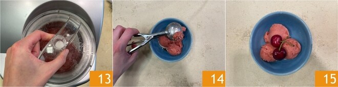 En cuanto esté bien mantecado y cremoso 13 trasladadlo al congelador por al menos 15-20 minutos. Con la ayuda de un sacabolas de helado, trasladad el sorbete a un tazón 14, decorad con cerezas frescas y servid 15.