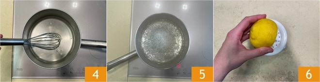 Mezclad con un batidor 4 y llevad a ebullición 5; luego dejad enfriar completamente. Exprimid el jugo del limón 6.
