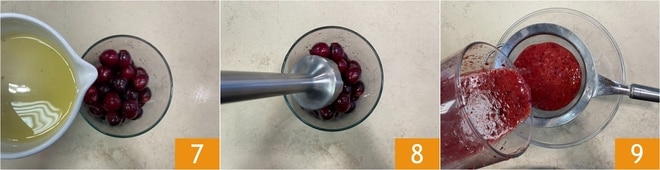 Trasladad las cerezas a un recipiente alto y estrecho, añadid el jugo de limón 7 y batid con una batidora de inmersión 8. Una vez obtenida una pulpa, pasadla por un tamiz de malla fina 9, recogiéndola en un tazón.