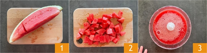 Para preparar el sorbete de sandía con claras de huevo toma la sandía 1, elimina la cáscara y extrae 600 gr de pulpa (si deseas, puedes quitar las semillas) en cubitos 2. Con la ayuda de una batidora, tritura la pulpa 3.