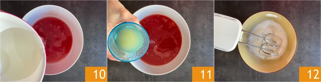 Transcurrido el tiempo de enfriamiento, añade a la pulpa de sandía el jarabe de azúcar 10 y el zumo de limón 11. Monta las claras a punto de nieve firme 12.