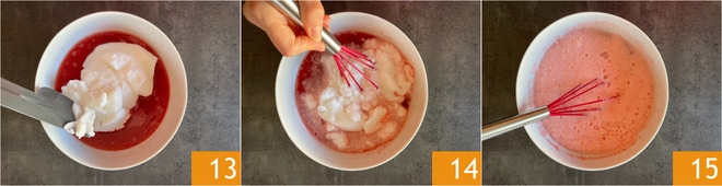 Añádelas a la mezcla de sandía 13 y mezcla bien con la ayuda de una batidora 14, debes obtener una mezcla homogénea 15.