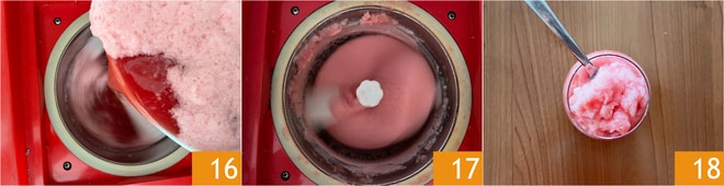 Vierte la mezcla bien fría en la heladera 16 y deja mantecar hasta obtener un sorbete cremoso 17, tardará unos 20-30 minutos. Sirve el sorbete de sandía con claras bien frío y disfrútalo inmediatamente.