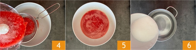 Cuélala 4, para obtener solo la parte líquida 5. Ahora dedícate a la preparación del jarabe de azúcar: vierte en un cazo el agua y el azúcar 6.