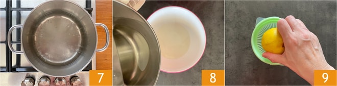 Lleva a ebullición hasta que el azúcar se haya disuelto 7. Transfiere el jarabe a un recipiente y déjalo enfriar. Luego transfiere al frigorífico, por al menos media hora, tanto el jarabe como la pulpa de sandía, para que se enfríen bien. Pasado el tiempo necesario, exprime un limón con el exprimidor 9 y filtra el zumo.