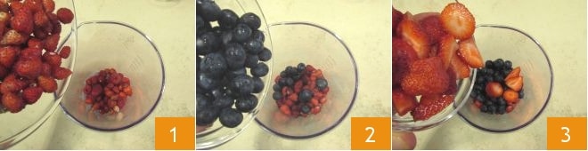 Para preparar el sorbete de frutos rojos, en un bol poned las frambuesas, las fresitas del bosque 1, luego añadid los arándanos 2 y las fresas 3.