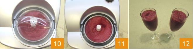 luego encendedla durante 30 minutos 10. Si no tenéis heladera, podéis proceder de la siguiente manera: verted la mezcla en un recipiente amplio y ponedlo en el congelador durante al menos una hora. Luego sacadla, removédla con un tenedor y repetid la operación hasta obtener la consistencia deseada cada media hora aproximadamente. En este caso, usando la heladera, una vez pasados los 30 minutos, detenédla: ¡habréis obtenido una mezcla de consistencia bastante compacta pero también cremosa! 11 ¡Vuestro sorbete de frutos rojos está listo para ser servido 12!