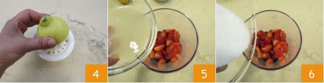 Exprimid un limón 4, luego filtrad bien el jugo ayudándoos con un colador, para eliminar todas las semillas. Verted el jugo de limón en el bol con la fruta 5, luego añadid el azúcar 6.