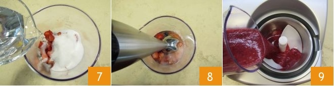 Agregad también el agua 7, después triturad todo hasta obtener una mezcla homogénea. Verted la mezcla en una heladera 9,