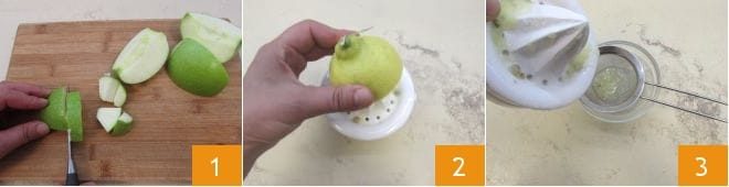 Para preparar el sorbete de manzana verde, primero lavad una manzana verde y cortadla en trozos, sin quitarle la piel 1. Exprimid un limón 2, luego filtrad el jugo obtenido 3 para retener las semillas.