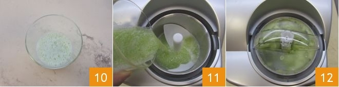 Una vez batidos los ingredientes 10, transferid la mezcla a la heladera 11 y ponedla en marcha durante unos 25 minutos 12. Si no tenéis heladera, podéis proceder de la siguiente manera: verted la mezcla en un recipiente ancho y ponedlo en el congelador durante al menos una hora. Luego sacadlo, removadlo con un tenedor y repetid la operación hasta obtener la consistencia deseada cada media hora aproximadamente.