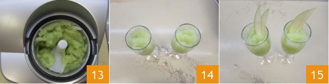 Una vez transcurrido el tiempo indicado, detenéis la heladera y transferid vuestro sorbete en vasitos 14, que podéis decorar con dos finas rodajas de manzana. ¡Vuestro sorbete de manzana verde está listo para ser degustado 15!