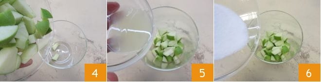 A continuación, verted los trozos de manzana en un bol 4, añadid el zumo de limón 5 y el azúcar 6,