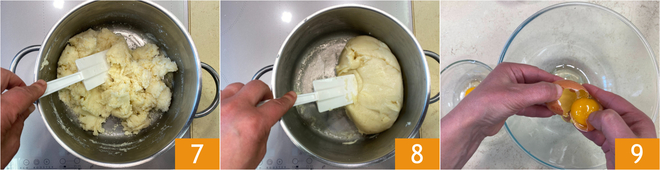 Añade primero dos yemas 10, mezcla para mezclar 11 y finalmente añade la última yema 12. Mezcla nuevamente y deja enfriar completamente.