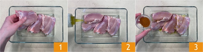 Para preparar los muslos de pollo en freidora de aire, lo primero que tenéis que hacer es colocar la carne en un bol 1, condimentar con aceite 2 y pimentón 3. Nosotros hemos utilizado muslos sin piel, pero si lo preferís podéis usarlos con piel.