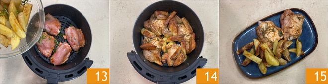 Poned los muslos en la cesta de la freidora de aire de 6 litros y añadid las patatas 13. Cocinad a 180°C durante 30 minutos, dando la vuelta a la carne a mitad de cocción 14. Los muslos de pollo en freidora de aire están listos para ser degustados 15.
