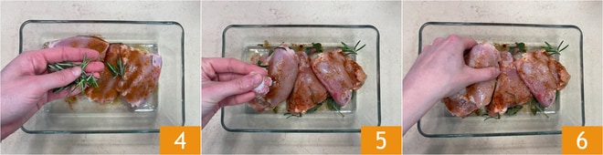 Añadid también el romero 4, sal 5 y pimienta. Masajead la carne 6 para que se impregne bien de sabor.