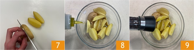 Después de lavarlas minuciosamente, cortad las patatas en gajos 7; ponedlas en un bol y condimenta con aceite 8, sal y pimienta 9.
