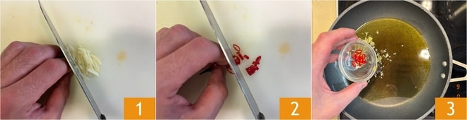 Para preparar los spaghetti aglio, aceite y guindilla risottati, primero poned a hervir una olla de agua con sal para cocer la pasta. Mientras tanto, cortad el ajo 1 y la guindilla en trozos 2, luego picad finamente el perejil. Verted el aceite, el ajo y la guindilla en una sartén grande 3.