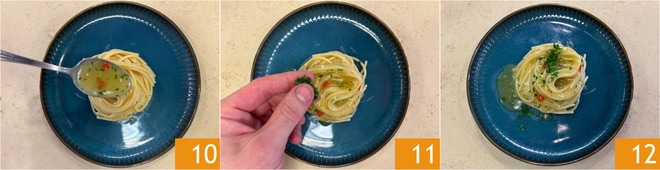 Emplatad los spaghetti con su salsa 10 y decorad con más perejil al gusto 11. ¡Servid inmediatamente vuestros spaghetti aglio, aceite y guindilla risottati 12!
