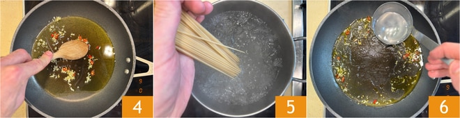 Freíd a fuego lento durante un par de minutos, teniendo mucho cuidado de no quemar el ajo 4. Cuando el agua haya llegado a ebullición, coced los spaghetti durante la mitad del tiempo de cocción indicado en el paquete 5. Mientras tanto, añadid al sofrito un cucharón del agua de cocción de la pasta 6.