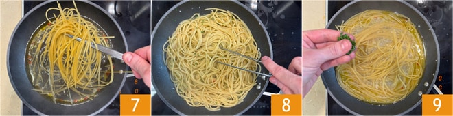 Escurrid los spaghetti directamente en la sartén 7 y terminad de cocerlos añadiendo más agua de cocción, si es necesario, y removiendo a menudo como si fuera un risotto 8. Finalmente, aromatizad con el perejil picado 9.