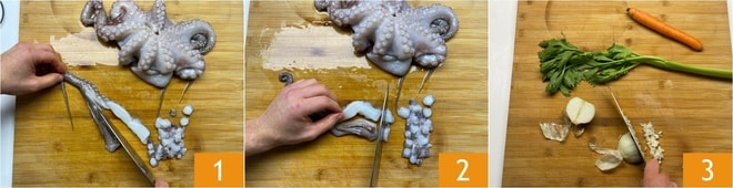 Para preparar los espaguetis a la guitarra con ragú de pulpo, lo primero asegurad que el pulpo esté bien limpio, sin ojos ni pico. En este punto, separad los tentáculos y divididlos por la mitad 1, luego cortadlos en trozos de aproximadamente medio cm 2. Preparad las verduras para el sofrito, picad finamente la zanahoria, el apio y la cebolla 3.