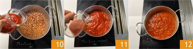 Cuando el alcohol se haya evaporado, añadid también el puré de tomate 10. Luego enjuagad la jarra con un poco de agua y vertedla en la olla 11. Añadid solo una pizca de sal y cocinad durante 40 minutos, hasta que el pulpo esté tierno. Si es necesario, podéis añadir agua si la salsa se reduce y prolongar la cocción.