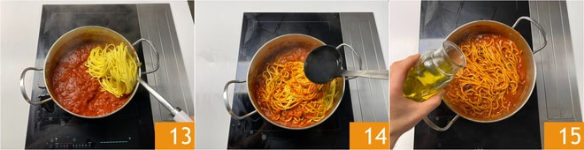 Coced los espaguetis a la guitarra en abundante agua hirviendo con sal, escurridlos y transferidlos al condimento 13. Añadid un poco de agua de cocción 14 y un chorrito de aceite 15.