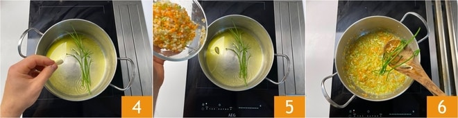 Separad los tallos de las hojas de perejil y picad estas últimas. Reservadlas, cubriéndolas con un paño húmedo. En una cacerola grande, verted un chorrito de aceite, añadid los tallos de perejil y el diente de ajo 4. Encended el fuego y añadid también el picadillo recién preparado 5. Dejad que tome sabor y, cuando el sofrito esté bien pochado, eliminad tanto los tallos de perejil como el ajo 6.