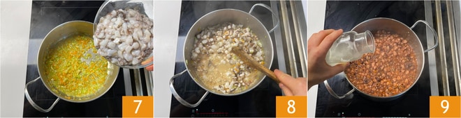 Añadid entonces los cubos de pulpo 7 y mezclad. Cocinad durante algunos minutos 8 y, cuando el agua se haya evaporado, rociad con el vino blanco 9.