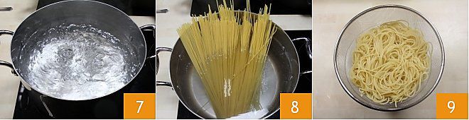 Ahora nos ocupamos de la pasta: ponemos al fuego una olla con fondo profundo adecuada para cocer los espaguetis, una vez que hierva 7 añadimos los espaguetis 8. Cocemos la pasta al dente y luego la escurrimos 9.