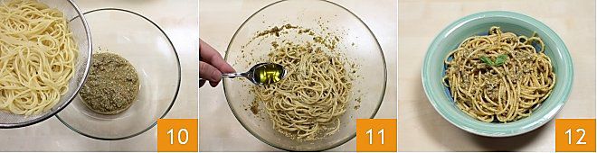 Los añadimos al pesto a la trapanese 10, mezclamos para amalgamar bien la salsa, condimentamos con un hilo de aceite 11 y llevamos a la mesa nuestros espaguetis con pesto a la trapanese adornados al gusto con hojitas de albahaca fresca 12.