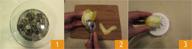 Para preparar los espaguetis con pesto de limón y almejas, empezad por estas últimas: dejadlas en remojo en abundante agua salada durante 1-2 horas 9, cambiando el agua un par de veces, para eliminar los posibles restos de arena 1. Mientras tanto, ocupadnos del pesto de limón: retirad la ralladura del limón con un pelador, teniendo cuidado de no llevaros la parte blanca 2, luego exprimid su jugo 3.
