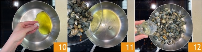 Después de haber dejado las almejas en remojo, enjuagadlas cuidadosamente y proceded con la cocción: en una sartén calentad una cucharada de aceite de oliva con un diente de ajo 10 y el chile fresco. Verted las almejas 11 y, cuando el aceite comience a chisporrotear, desglasad con el vino blanco 12. Dejad evaporar el alcohol.