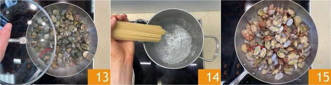 Tapad con la tapa 13 y dejad que las almejas se abran a fuego alto, tardarán unos 5 minutos. Mientras tanto, coced los espaguetis al dente en abundante agua salada 14. Cuando las almejas se hayan abierto 15, apagad el fuego.