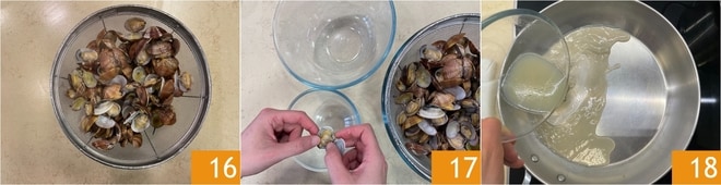 Coladlas en un colador y recoged su agua de cocción 16. Quitad las cáscaras de las almejas 17 conservando algunas enteras para emplatar. Verted el agua de cocción de las almejas en la misma sartén 18.